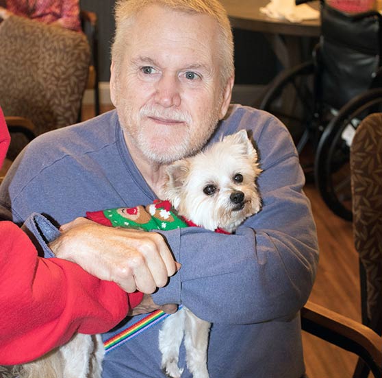 Science has proven that touch between a human and a furry friend can have therapeutic benefits for both species. We witness this mutual benefit every week, when our volunteer team, along with ambassador dogs and kittens, visit Daybreak Village, a welcoming assisted living facility located near our center. This rewarding program allows the residents to cuddle with our adoptable pets and share their own heartwarming stories about furry companions they’ve had in their lives.