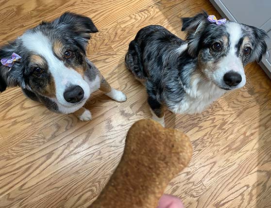 To help them learn quickly, always say their name in connection with a positive action (like a scratch on the tummy) or a treat. Always say their name in connection with training as well by saying, “Boomer-SIT.” Before you know it, Boomer will be responding to his name as if it has followed him everywhere.
